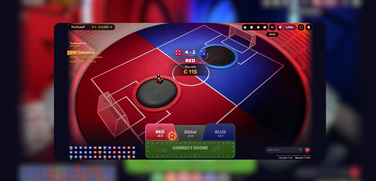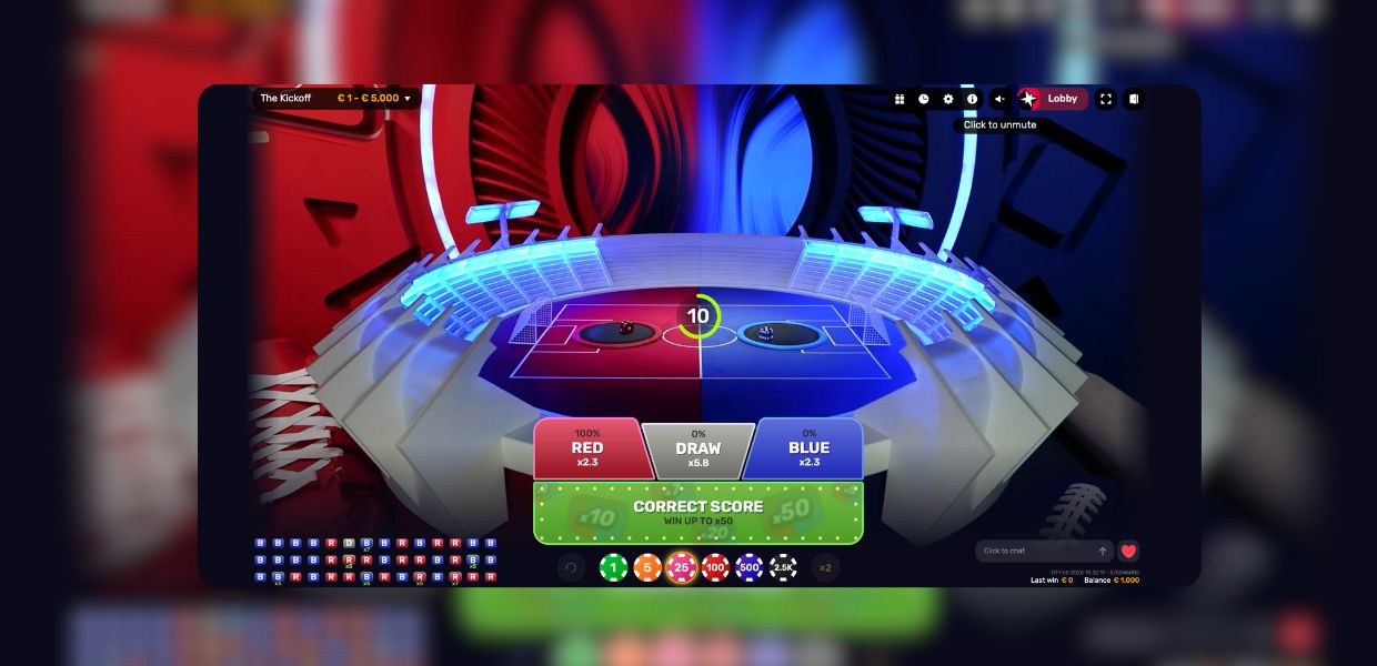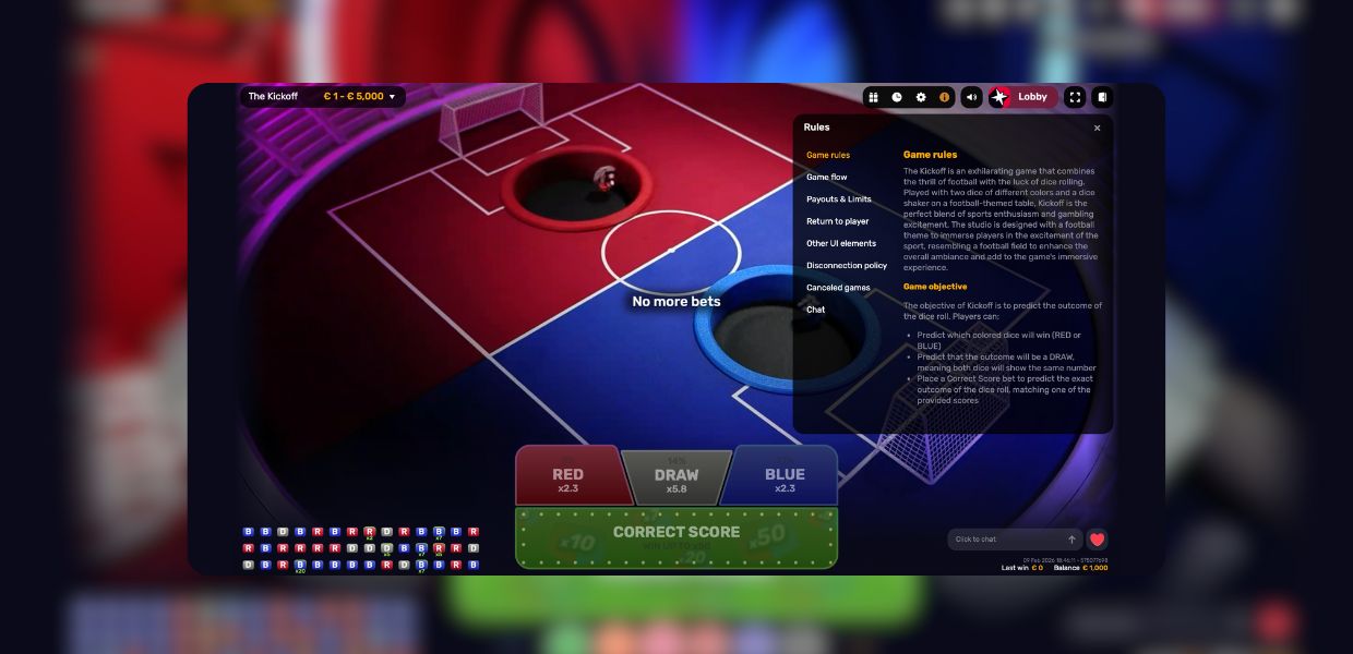 The Kickoff is a football themed live casino game streamed directly from our Sport Studio. Set inside a dynamic miniature stadium, the game combines live two dice gameplay with multiple betting options and real time score multipliers. Players choose between the red or blue team, with every roll delivering fast paced football action and shared excitement, bringing the energy of match day straight to the screen.
