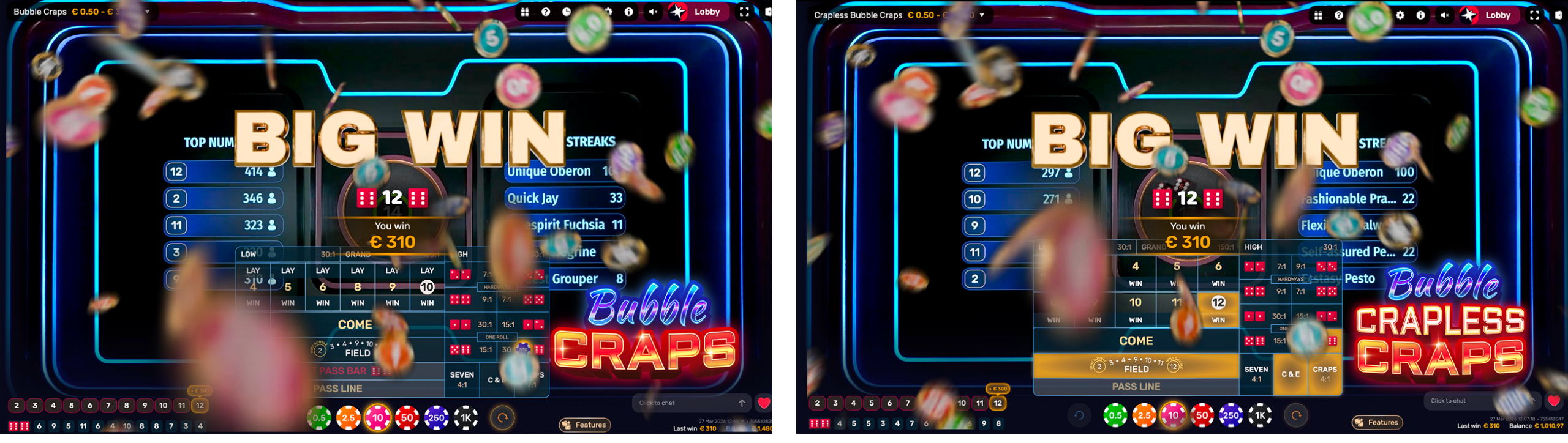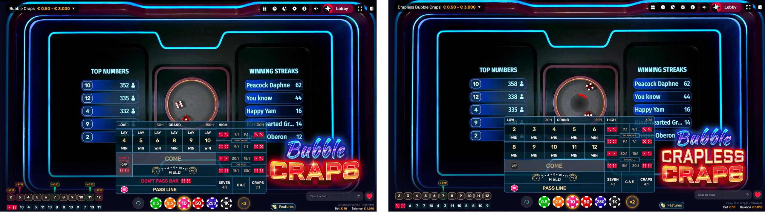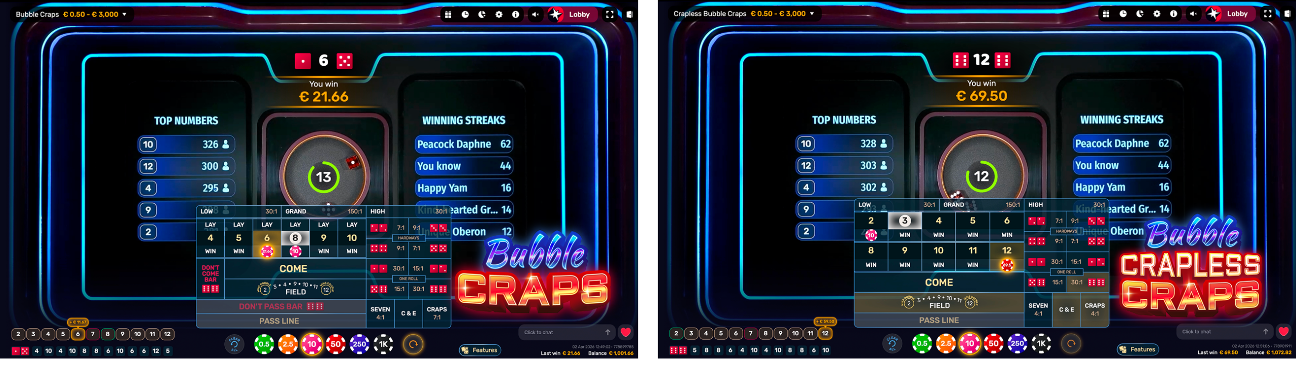 - Bubble Craps: Ideal for players who prefer traditional table dynamics and the strategic balance of the classic ‘Pass/Don’t Pass’ experience