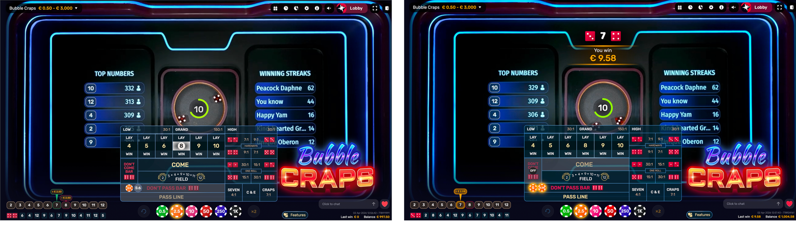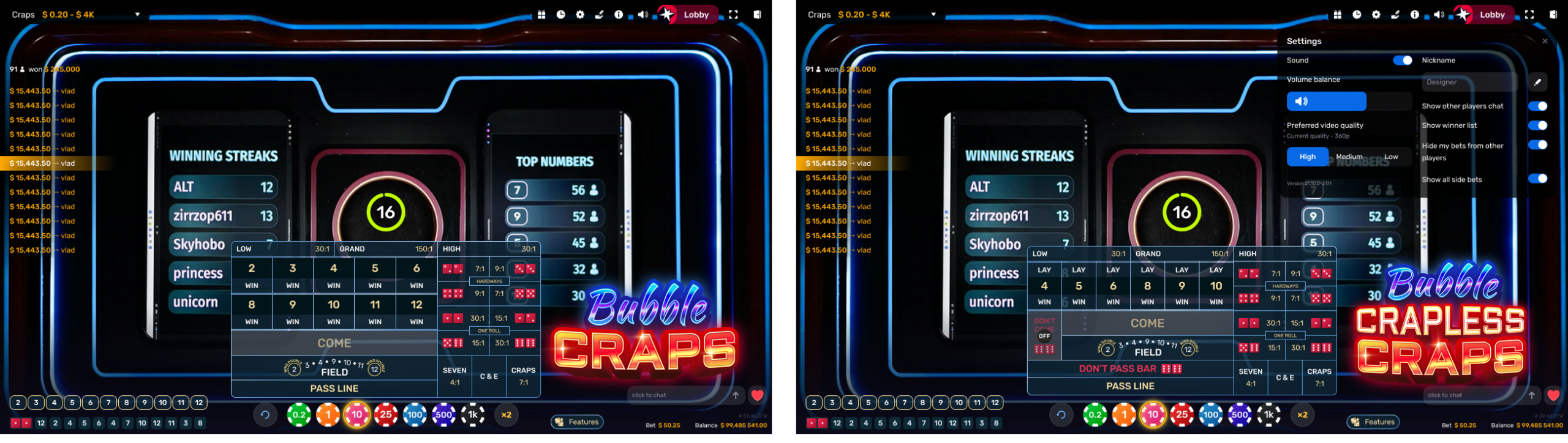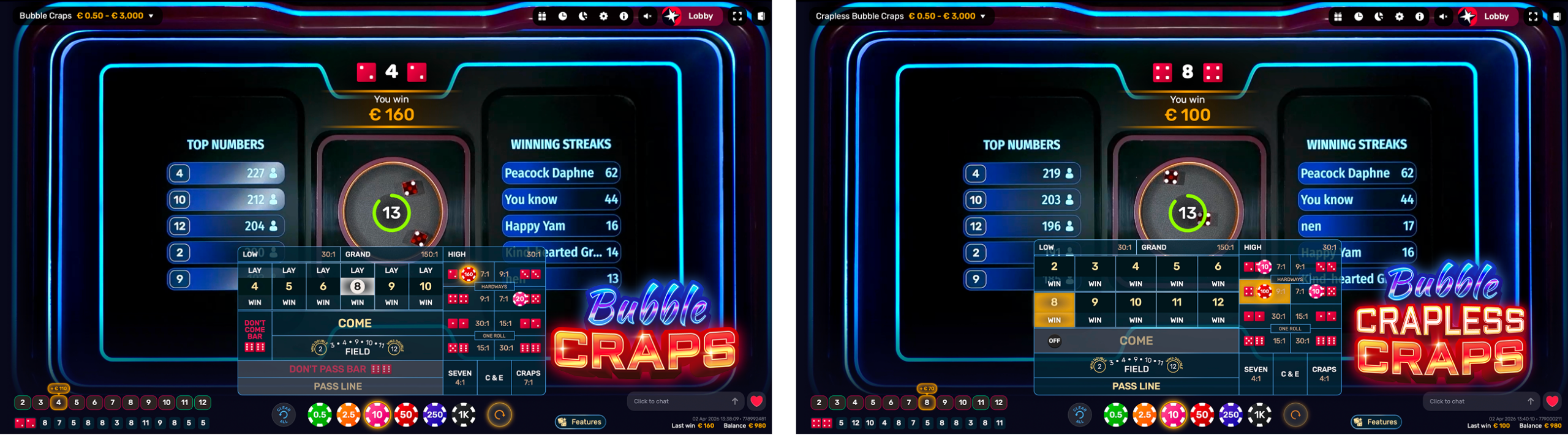 - Bubble Craps: Ideal for players who prefer traditional table dynamics and the strategic balance of the classic ‘Pass/Don’t Pass’ experience